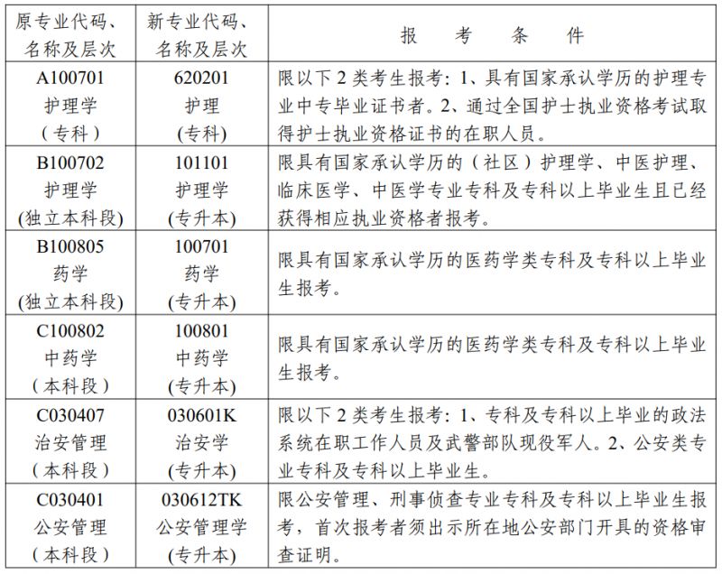 三、報考本科專業(yè)的考生入籍時需提交《教育部學(xué)籍在線驗證報告》《教育部學(xué)歷證書電子注冊備案表》(至少半年驗證有效期)或《中國高等教育學(xué)歷認證報告》;報考護理、護理學(xué)、藥學(xué)、中藥學(xué)、治安學(xué)、公共安全管理、公安管理學(xué)、監(jiān)所管理等有前置條件的專業(yè)(見附件)的考生入籍時需要提交相關(guān)證件證明等材料。